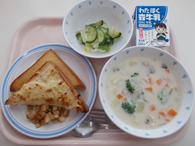 二色パン ホワイトシチュー グリーンサラダ 牛乳