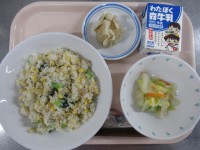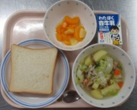 <献立>ごはん、なめたけ、いかのにんにく醤油焼き、野菜の甘酢かけ、みそけんちん汁、牛乳