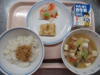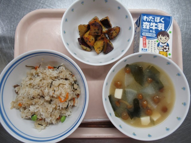 <献立>磯ごはん、みそ汁、大学芋、牛乳