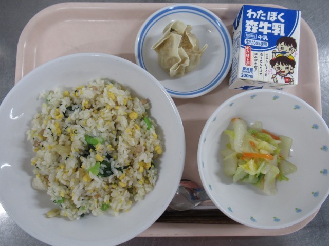 <献立>青菜のチャーハン、ジャンボしゅうまい、辣白菜、牛乳