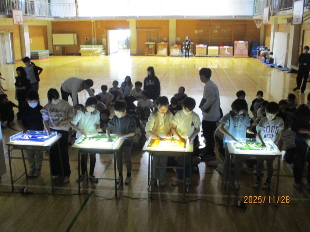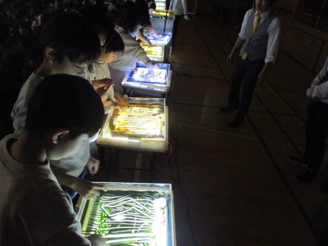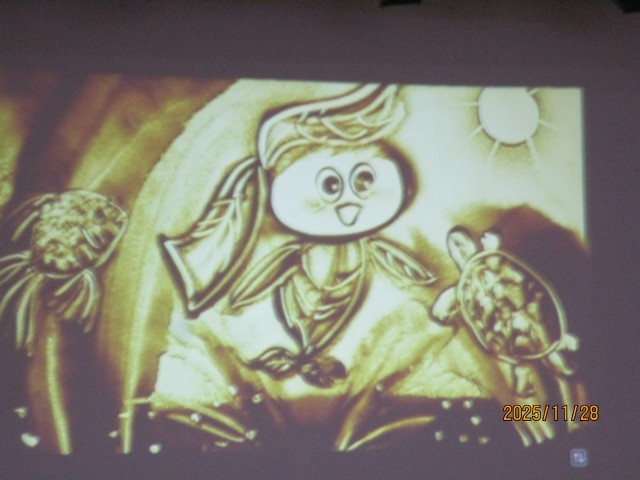11月28日にサンドアーティストのKoheiさんをお招きして、ガラスのキャンバスに砂で描く物語のパフォーマンスを参観しました。前の砂が少しの変化で全く違う砂絵に変わる展開に、子どもたちは驚きと感動の大きな歓声を上げていました。