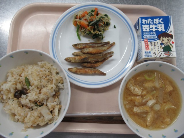 【本日の献立】里芋としめじのご飯、味噌汁、わかさぎのから揚げ、ごま和え、牛乳