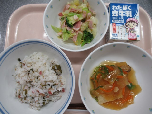 <献立>梅わかめごはん、魚のから揚げ野菜あんかけ、ハムサラダ、牛乳