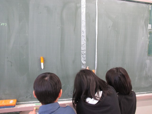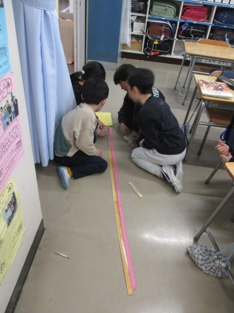 算数で「長い長さ」の学習をしています。前回の授業で「100cmを1mと表す」ことを学習したので、今回は実際に身の回りの物の長さを測って「m」を使って表しました。長い長さを一人で測ることは難しいので、互いに声をかけ合って活動を進めました。測る前に予想を立てたことで、「これは1mより短そうだから、30㎝のものさしで測ろう」や「黒板の横は3mくらいありそうだから4人で測ろう」などと、適切な道具や方法を用いて測ろうとする姿が見られました。
