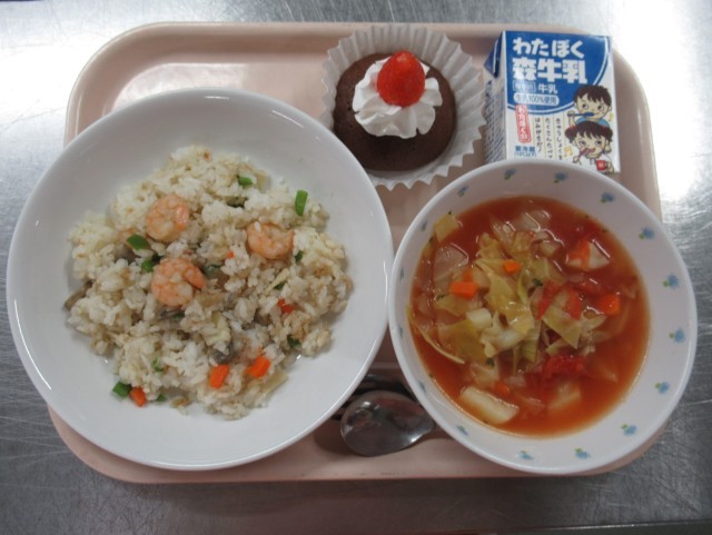 <献立>シーフードピラフ、ミネストローネ、チョコブラウニー、牛乳