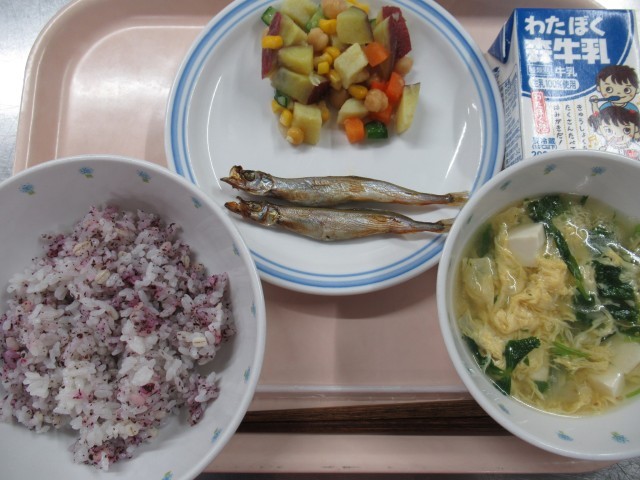 <献立>ゆかりご飯、かきたま汁、焼きししゃも、さつまいものコロコロサラダ、牛乳