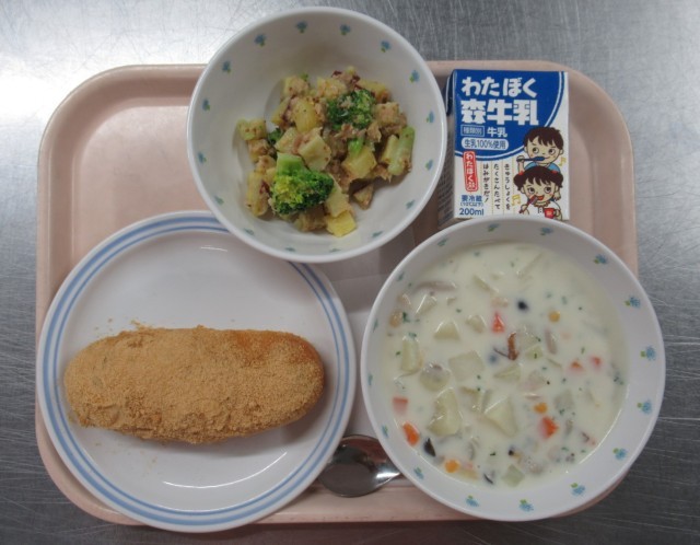 <献立>きな粉揚げパン、クラムチャウダー、さつまいものハニーマスタードサラダ、牛乳