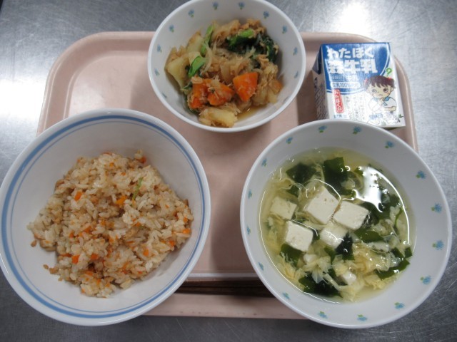 献立 鶏そぼろごはん 若竹汁 じゃが芋のツナ煮 牛乳