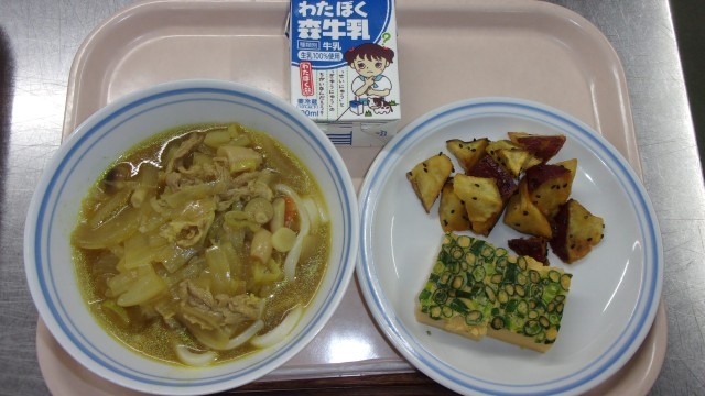 献立 カレー南蛮うどん だし入り卵焼き 大学芋 牛乳