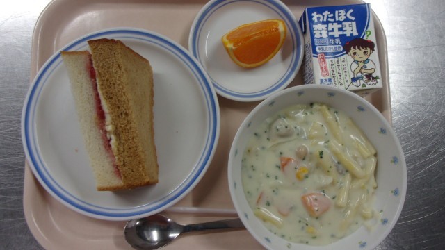 献立 にしょくパン(いちご・クリームチーズ) マカロニのクリーム煮 清見オレンジ 牛乳