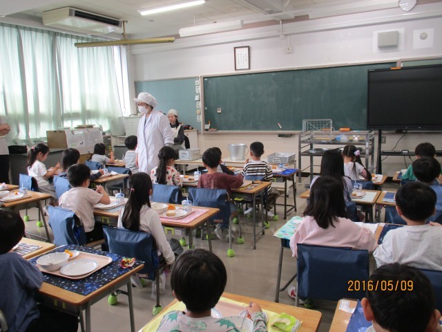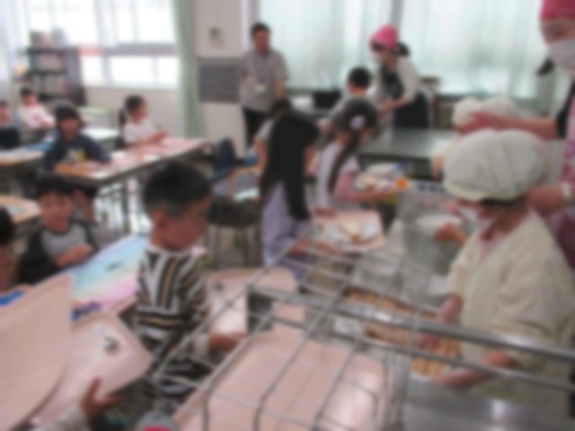 今日から給食が始まりました。休み時間の時から「おなかがすいた!」と給食を楽しみにしている様子が見られました。栄養士の先生から「たのしい給食」にするために給食の役割や配膳の仕方を教えていただき、一生懸命準備しました。食べ始めると「おいしい!」や「牛乳は苦手だけど頑張って飲んでみる」という声が挙がり、始めての給食を楽しむことができたようです。片付けも、丁寧にお皿を置いたり、スプーンの向きを揃えて入れたりすることができました。