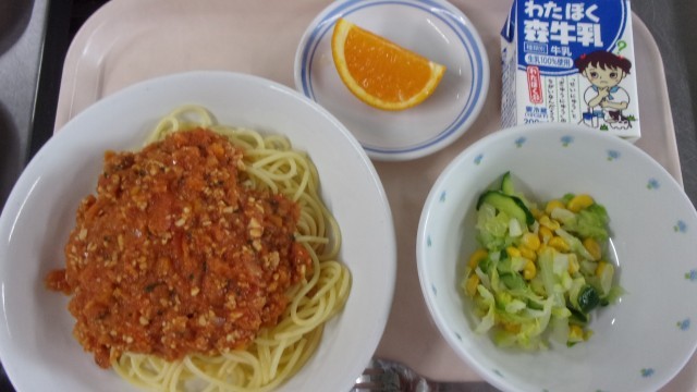 献立 ビーンズミートソース コールスローサラダ きよみオレンジ 牛乳