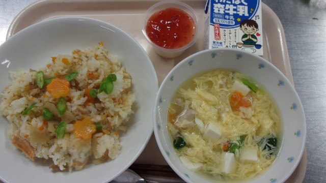 今日は、1年生を迎える会でした。給食ではちらし寿司でお祝いしました。