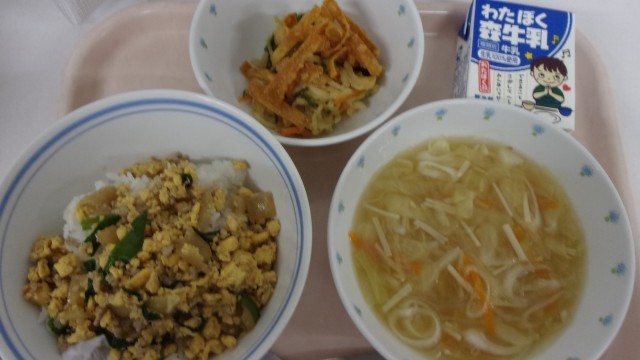 献立 にらたま丼 春雨スープ パリパリサラダ 牛乳