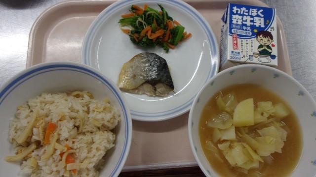 献立 たけのこごはん 春野菜のみそ汁 鯖の塩こうじ焼き 菜の花のからし和え 牛乳