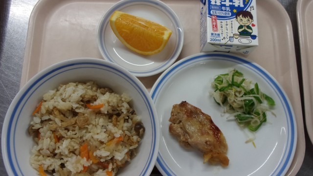 献立 切干しごはん 鶏肉のみそ漬け焼き もやしのソテー はっさく 牛乳