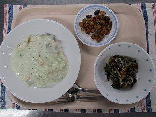 とり肉や玉ねぎ、マッシュルームを炒めて、鶏ガラスープと牛乳で煮込み、調味をしたらルウを加えてとろみを付けます。コクのあるホワイトソースは、キャロットライスとの相性も良く、バターの風味も感じられるため、子どもたちにも大好評でした。
