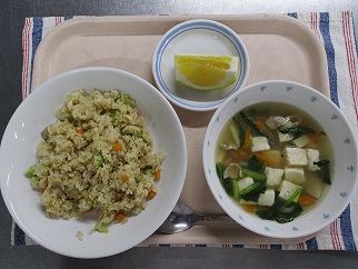 給食は、旬の食材である枝豆をチャーハンに入れました。また、スープに入っていた小松菜は、東京都でとれたものです。今日は、旬や地産地消の食材を取り入れて給食を作りました。みんな残さず食べていて、暑さにも負けず丈夫な体をつくることに繋がりました。