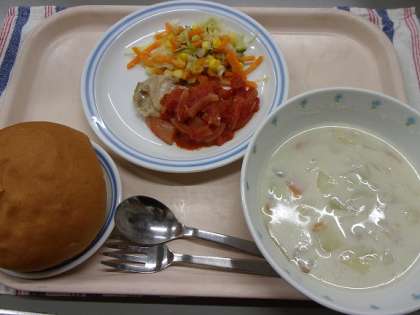 今日は、給食室で手作りしたトマトソースをチキンソテーにかけていただきました。