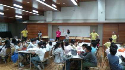 八ヶ岳林間学園に戻ってきました。お弁当箱の片付け方を聞いています。