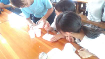 できたバターに塩味をつけたり、脱脂乳をコップに分けたりしています。