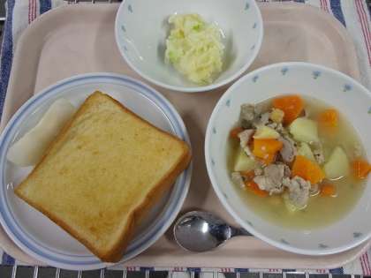 今日は、子供たちが食べ慣れている野菜スープに、豚肉とひよこ豆を加えて作りました。シチューというよりは、スープに近い出来上がりです。