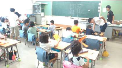 6年生がめあての書き方を教えてあげています。