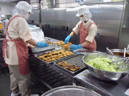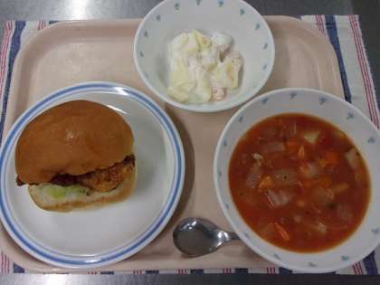 下味をしたたらに衣をつけて油で揚げた魚のフライを、今日はパンにサンドしていただきました。手作りのフィッシュバーガーです。