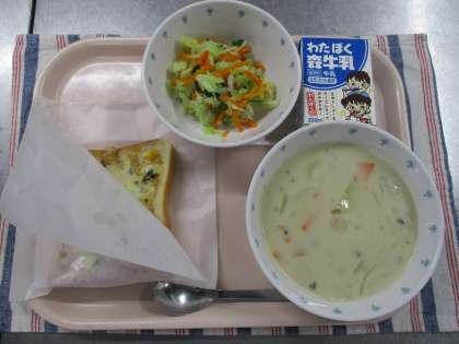 今日のスープは、クラムチャウダーでした。クラムチャウダーは、鉄分の多いあさりや、カルシウムの豊富な牛乳を使って作る料理で、子供たちの成長を支える栄養をしっかり補えます。クラムチャウダーは、鶏ガラでとったスープと、給食室で作ったホワイトルウでよく煮込みます。コクがあり、食材のもつうま味も感じられます。