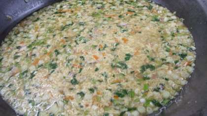 赤カブの葉を彩りに入れました。寒くなると野菜は糖分(甘味)が増します。