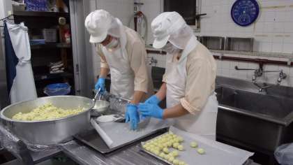 今日は、郷土料理のコラボです。「びりん飯」「せんだご汁」は熊本県の郷土料理で、「柿なます」は島根県、奈良県、山形県の郷土料理といわれています。今が旬の柿やさつま芋を使って作りました。「びりん飯」は絞り豆腐が入っています。絞り豆腐を油で炒める時に「びりん、びりん」と音がするところからこの名前がついたそうです。せんだご汁は、八王子でとれたものを使用しました。蒸したさつま芋をつぶしてさつまいもでんぷんを加えてだんごにしました。ほんのり甘いだんごで色もきれいでした。