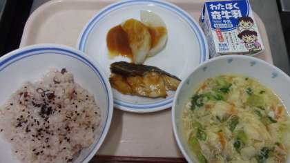 献立 赤飯 かきたま汁 鰤の照り焼き ふろふきだいこん 牛乳