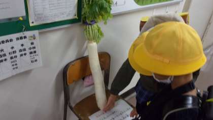 ふろふき大根は、東京都は八王子市でとれた「大藏大根」です。展示をすると「大きな大根だ。」「色が白い。」「先が細くない。」など普段自分が見ている大根(青首大根)との違いを感じていました。大根にも色々種類があることに気が付いたようです。