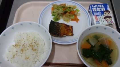 献立 ごまご飯 すまし汁 鯖の柚香味焼き おかか和え 牛乳