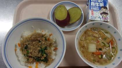 献立 根菜丼 みそ汁 さつまいもの甘煮 牛乳