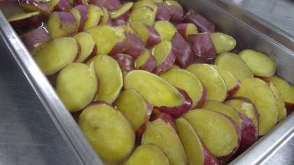 今日は、根菜をたくさん使った献立でした。根菜の歯ごたえを感じた優しい味の丼でした。さつまいもは、八王子市でとれた金時芋を使いました。黄色の色がとてもきれいでした。