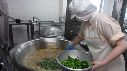今日は、野菜、魚介、肉、うずら卵とたくさんの食材を使った中華丼でした。最後に甘酢を入れます。味をはっきりさせることと、食欲を増す作用があります。豆腐入り春雨スープは、最後にこしょうを入れて味を調えました。