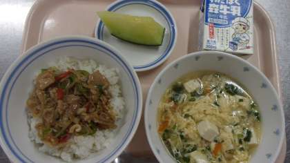 献立 トウヤロースー丼 きのことたまごの中華風スープ メロン 牛乳