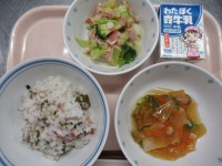 <献立>菜飯、もちきんちゃく汁、紅白なます、牛乳<今日の給食の食材>白菜:茨...
