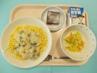 【今日の献立】ほうれん草ときのこのクリームパスタフレンチサラダブラウニー牛乳今日...