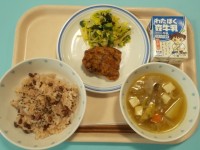 【今日の献立】お赤飯鶏のから揚げ糸寒天サラダけんちん汁牛乳今月、卒業式の6年生と...