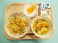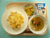 【今日の献立】五目チャーハンじゃがいものピリ辛サラダ冬瓜のスープ牛乳今日はスープ...
