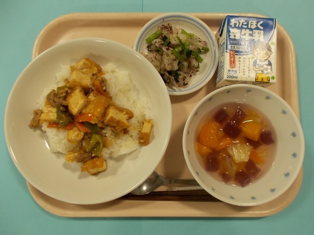 今日のゼリーポンチに入っているぶどうゼリーは寒天で固めています。寒天は海藻から作る食べ物で、お腹の中をきれいにしてくれる食物繊維が含まれています。