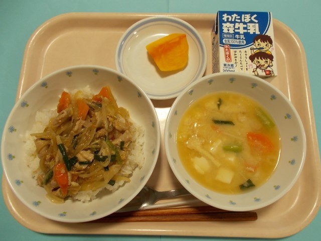 今日は体力を回復し、明日に備える給食です。脂質は控えめに、たんぱく質と疲れを回復するビタミンを含む豚肉、肌を丈夫にしてストレスから体を守るビタミンを含むにらや小松菜、柿を入れました。