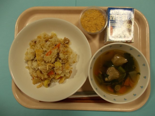 今日は、目黒にゆかりのある食べ物「さんま」「さつまいも」「たけのこ」をそろえた給食です。