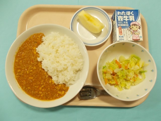 キーマカレーはひき肉のカレーのことです。今日のキーマカレーには、細かく挽いた大豆と豚ひき肉が入っています。