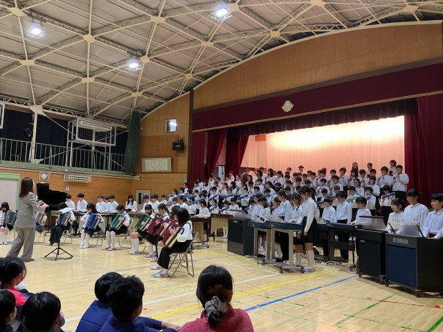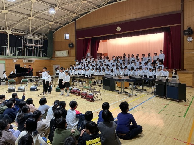 めぐろパーシモンホールで行う本番の前日に、4年生、6年生、保護者の方々の前で校内発表会を行いました。