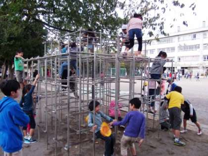 休み時間は、写真のように、ジャングルジムや長縄を使って、みんな元気に外遊びをしています。