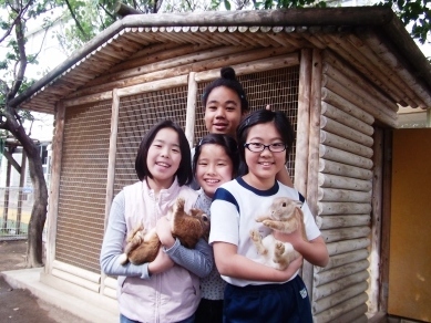 飼育委員は、休み時間にウサギの世話をしています。