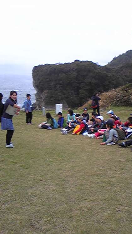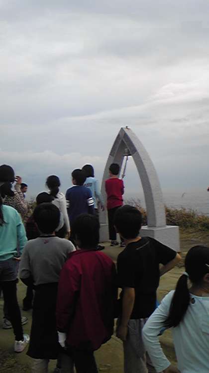 鵜原理想郷に到着しました。歩き疲れた子どもたちもホッと一息。幸せになれるという鐘をみんなで鳴らしました。